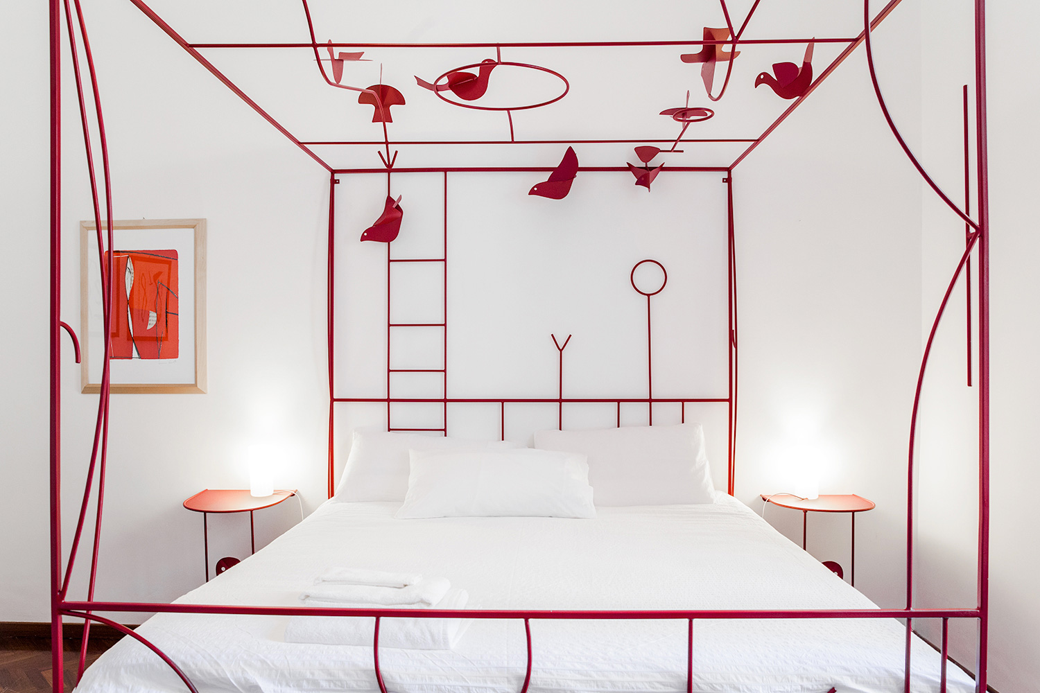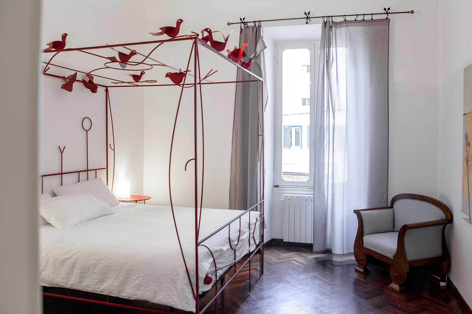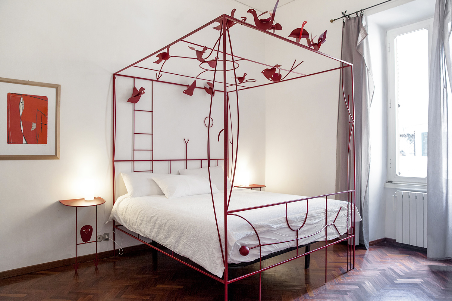 Intima e luminosa, circa 20mq, è fornita di un ampio letto matrimoniale disegnato da Tommaso Cascella e di un ampio armadio. Il pavimento è in parquet ed il letto è fornito di guanciali e set di lenzuola e coperte adatti per la stagione di visita.